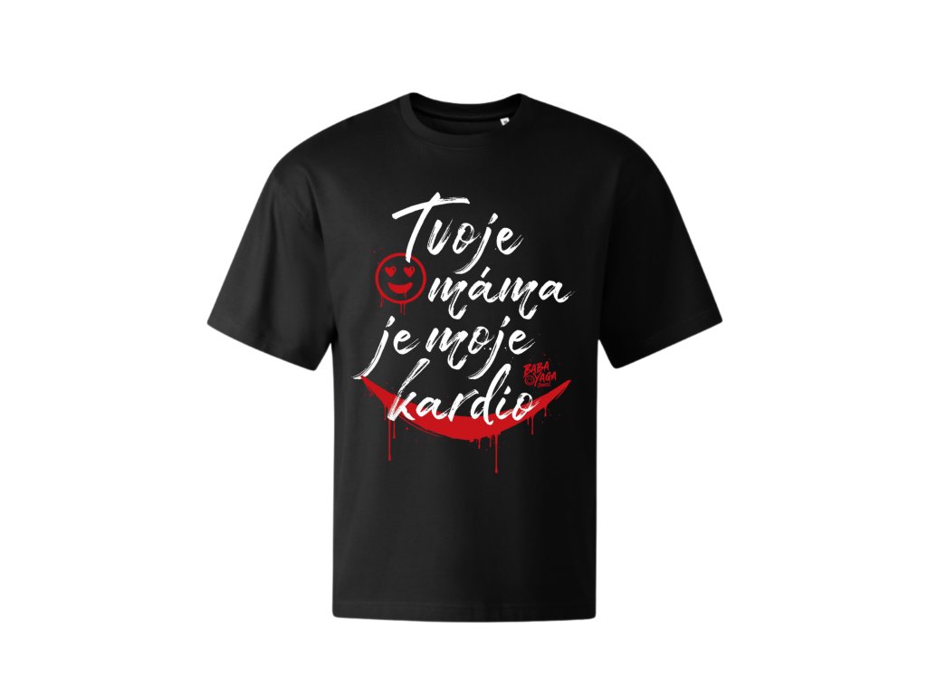 Černé tričko s nápisy „Tvoje máma je moje kardio“ a "Tvoje máma je moje kardio" je stvořené pro všechny, kdo vědí, že nejlepší kardio se nedá změřit hodinkami ani spálit na pásu.