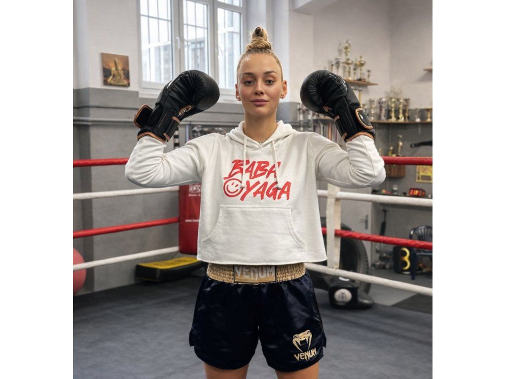 Stylová bílá crop mikina ze 100% bavlny. Krátký střih, kapuce a ikonický nápis BABA YAGA z ní dělají must-have kousek pro všechny fanynky BABA YAGA.🔥